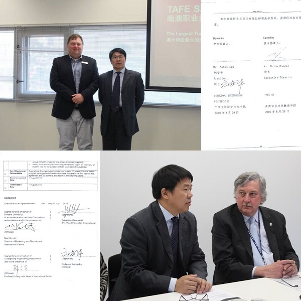 应澳大利亚弗林德斯大学、新西兰马尔伯勒理工学院分别邀请,2016年8月28-9月3日,校长刘安华、国际学院负责人韩立芳、建筑工程学院副院长陈淳慧和人文艺术学院副院长吴海彬等四人赴澳新交流。在澳大利亚期间,学校与澳大利亚弗林德斯大学达成专升硕合作协议以及与南澳职业教育学院签署合作备忘录。在新西兰期间,学校并与新西兰尼尔森马尔伯勒理工学院就深化合作达成协议,我校毕业生可以在通过相关语言测试后,可以直接前往澳大利亚、新西兰攻读本科或硕士。